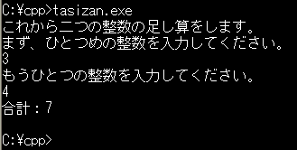 上の例はあまりにも無意味な例だったので、「二つの整数値をきいて、その合計を戻す」関数をつくって、その関数を使うプログラムを書いてみましょう。