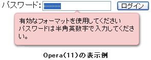 パスワード:<input type="password" name="pass" pattern="[a-zA-Z0-9]+" title="パスワードは半角英数字で入力してください。">