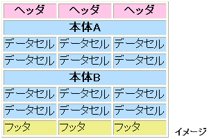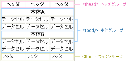 | 利用場所 | table要素の子要素として1つのみ(ただし、caption要素、colgroup要素より後で、かつtbody要素、tfoot要素、tr要素よりも前) |