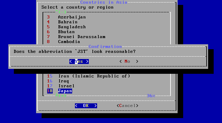 1. タイムゾーン設定 前ページからの続きです。 タイムゾーンの設定へと移行します。 「Asia」を選択して Enter