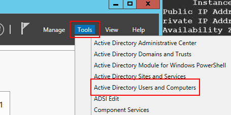 2.Server Managerの右上にあるTools>Active Directory Users and Computersをクリックします。