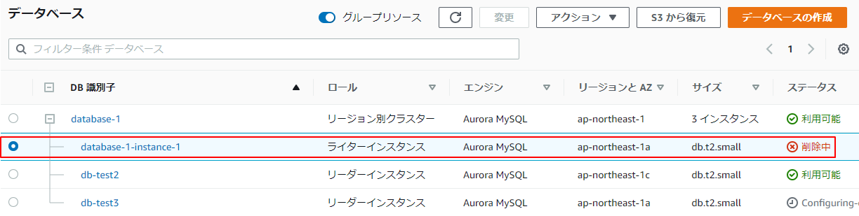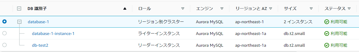 1.Auroraの一覧です。リージョン別クラスターとライターインスタンスがあります。