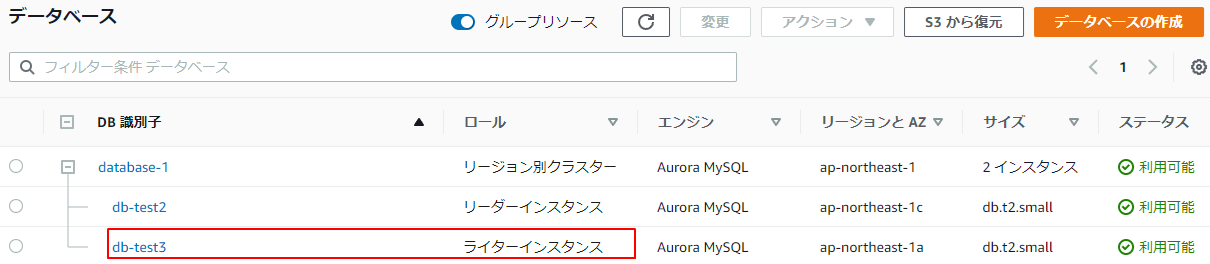 5.しばらくすると上記図までリーダーインスタンスだったdb-test3がライターインスタンスに変わっています。