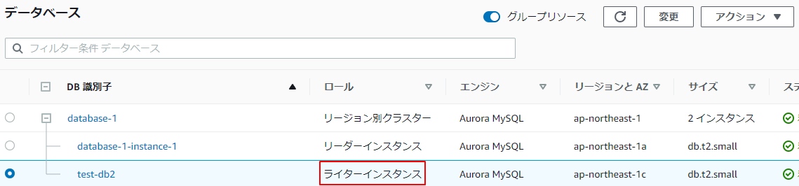 1.test-db2がライターインスタンスです。チェックを入れます。