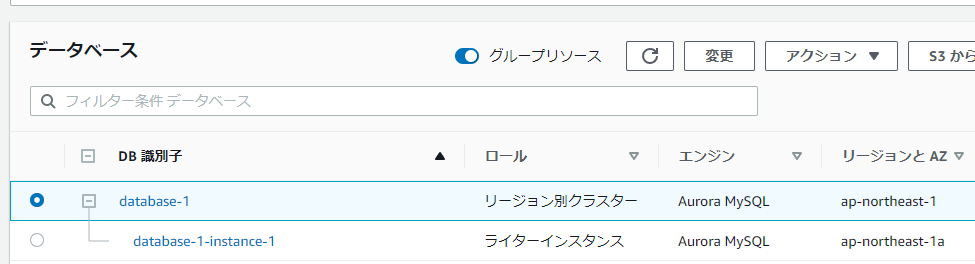 復元したdatabase-1はライターインスタンス、database-2はリーダーインスタンスになっています。
