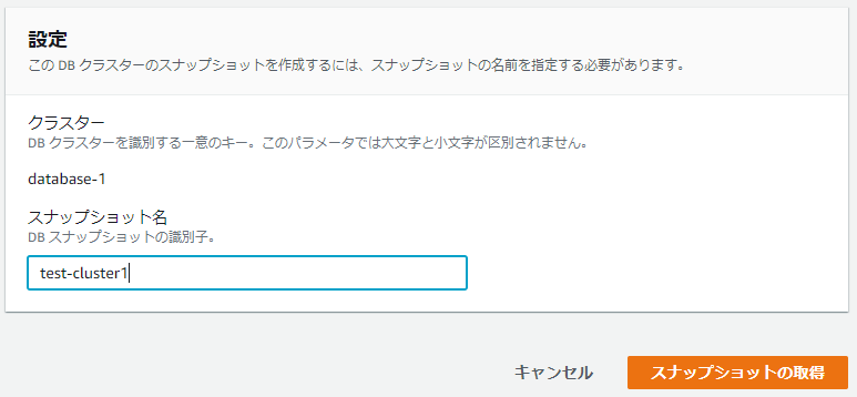 2.スナップショット名を入力(test-cluster1)し「スナップショットの取得」をクリックで作成されます。