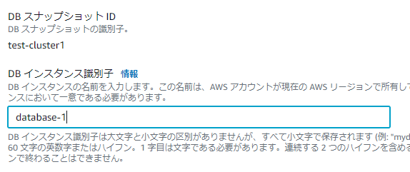 クラスターとインスタンスのスナップショットから復元しました。両方ともクラスターとインスタンスが復元されました。