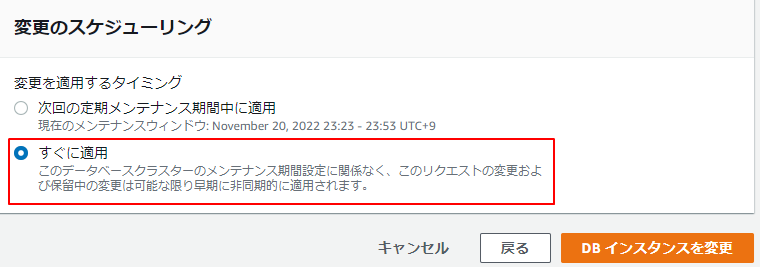4.変更をするタイミングは、すぐに適用を選択してDBインスタンスを変更をクリックします。