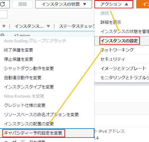 1.EC2を選択してアクション→インスタンスの設定→キャパシティ予約設定を変更をクリックします。