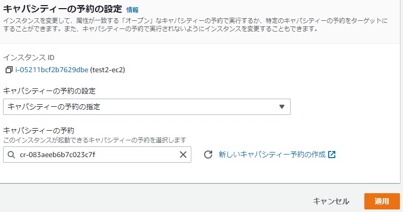 インスタンスの適格性は、対象を指定しました。EC2のインスタンスにこの予約IDを指定して紐づけます。