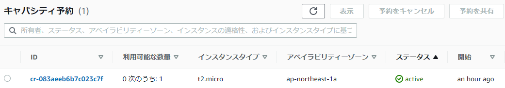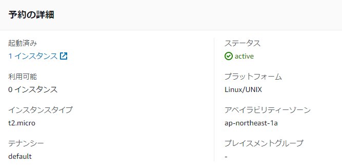 6.予約IDをクリックして詳細を見ると、起動で使用したので「起動済み」1インスタンスとなり、「利用可能」は0インスタンスとなっています。