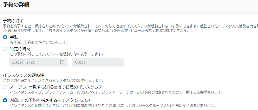 ※「オープン」を選択した場合で、対象のインスタンスがあった場合、インスタンスに予約IDが割り当てられます。インスタンスの詳細タブで予約IDを確認できます。