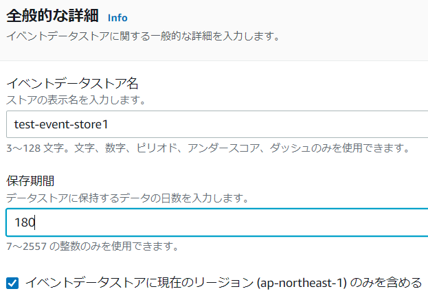 4.イベントデータストア名、保存期間を入力します。次へをクリックします。