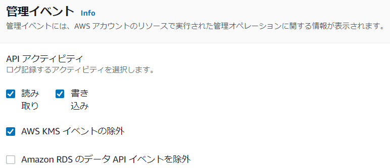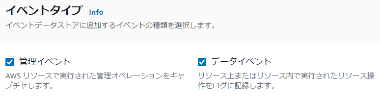 管理イベントは、ログインやEC2インスタンスの作成、削除等を指します。