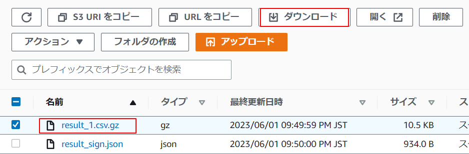 2.csv.gzの行にチェックをいれダウンロードをクリックするとCSVでダウンロードされます。