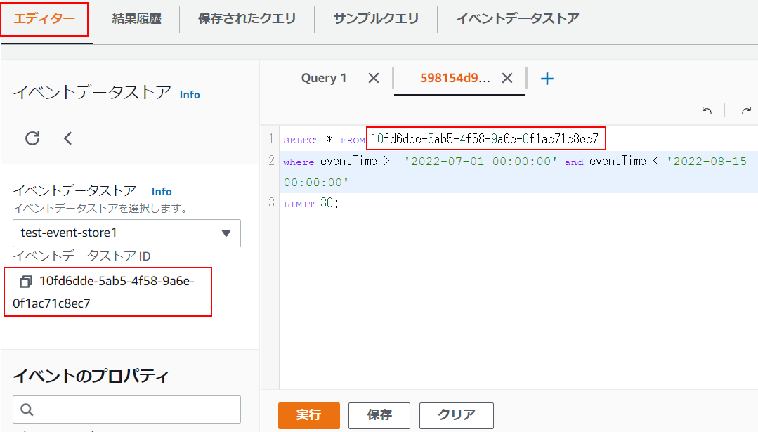 fromのテーブルを指定する箇所は、イベントデータストアIDを指定します。