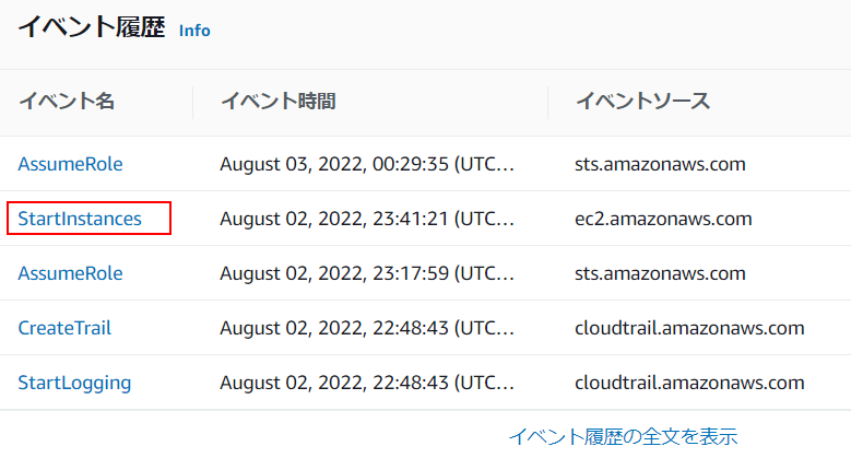 4.イベント履歴の「StartInstances」をクリックします。