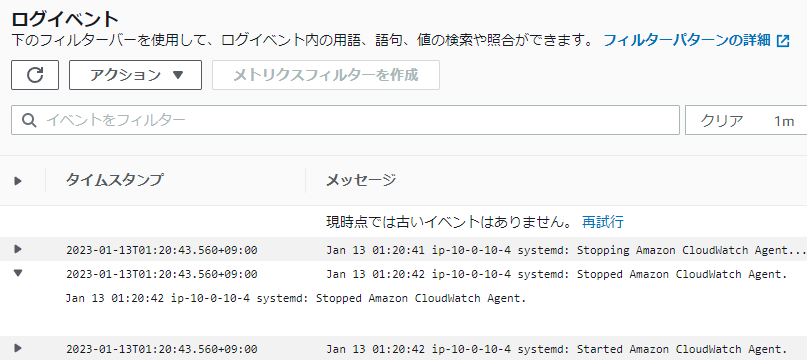すでに起動している場合は、再起動を行います。成功するとCloudWatchの画面のロググループに設定したログが表示されます。