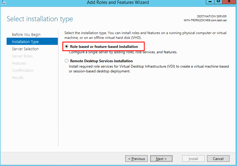 4.「Role-based or feature-based installation」を選択します。Nextをクリックします。