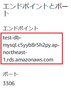 画面左のデータベースをクリックし、一覧の作成したMySQLのリンクをクリックし、接続とセキュリティタブにあるエンドポイントの値をコピーします。