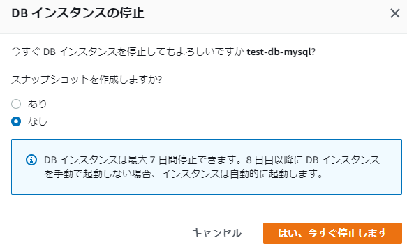 | 注意 | DBインスタンスの停止は7日間のみ |