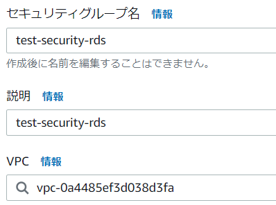 | vpcセキュリティグループ | 既存の選択で、test-security-rds |
