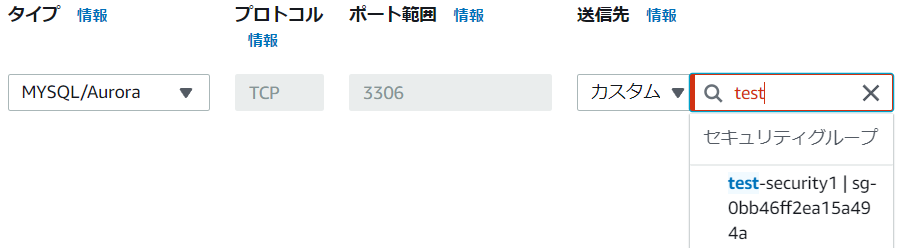 「インバウンドルール」で「ルールの追加」をクリックしMYSQL/Auroraを選択し、カスタムでは、testと入力し作成したtest-security1を選択します。完了後、「セキュリティグループを作成」をクリックします。