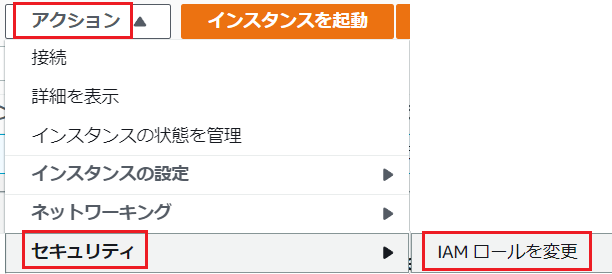 3.ロールを割り当てるEC2のインスタンスにチェックを入れ「アクション」>「セキュリティ」>「IAMロールを変更」をクリックします。