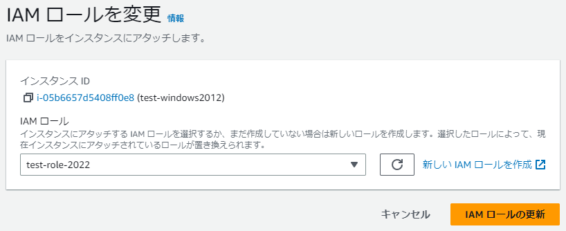 3.IAMロールの選択で作成したロールを選択し「IAMロールの更新」をクリックします。