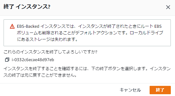 1.EC2の一覧で削除したいEC2を選択して「インスタンスの状態」→「インスタンスを終了」をクリックします。インスタンスは起動中/停止中どちらでも可です。