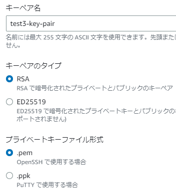 「キーペアのタイプ」はRSA、「プライベートキーファイル形式」は.pemを選択し(.pemはOpenSSHで使用する場合です)、「キーペアを作成」をクリックすると「test3-key-pair.pem」ファイルがダウンロードされます。
