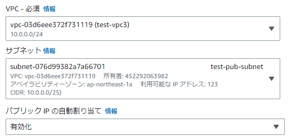 VPCとサブネットは作成したtest-vpc3とtest-pub-subnetを選択しました。