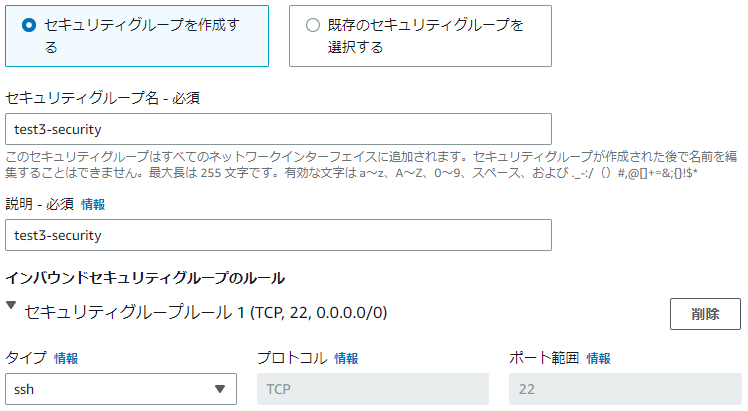 9.セキュリティグループ名は任意の名称をつけました。
