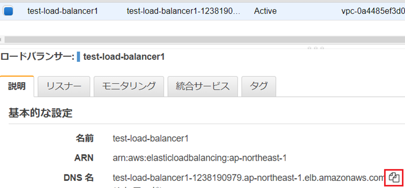 1.対象のロードバランサーをチェックし、画面下のDNS名の右にあるアイコンをクリックすると左のアドレスがコピーされます。