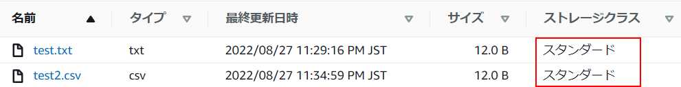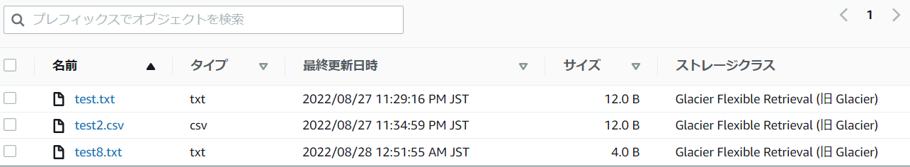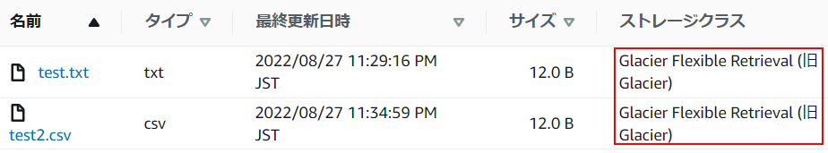 4.オブジェクトの一覧を表示するとストレージクラスはGlacierになっています。