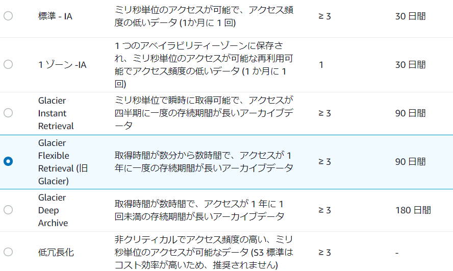 • Amazon S3 Glacierは Amazon S3 Glacier Flexible Retrieval という名前に変更されました。(2021/11/30の記事)