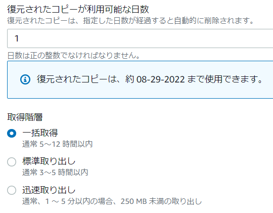 3.復元されたコピーが利用可能な日数は1日を設定しました。