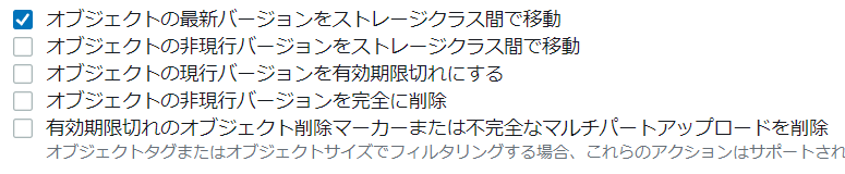 6.ライフサイクルルールのアクションは、「オブジェクトの最新バージョンをストレージクラス間で移動」にします。