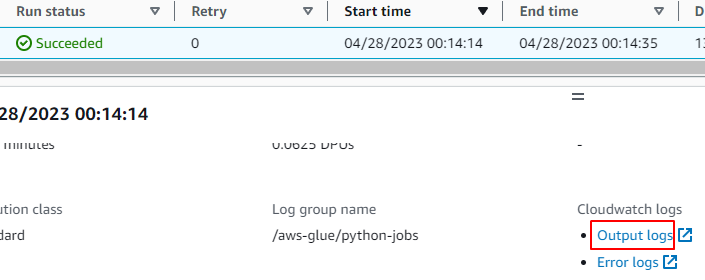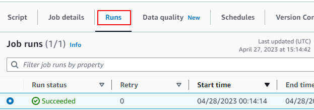 2.Runsタブをクリックします。ジョブが成功するとRun statusがSucceededになります。