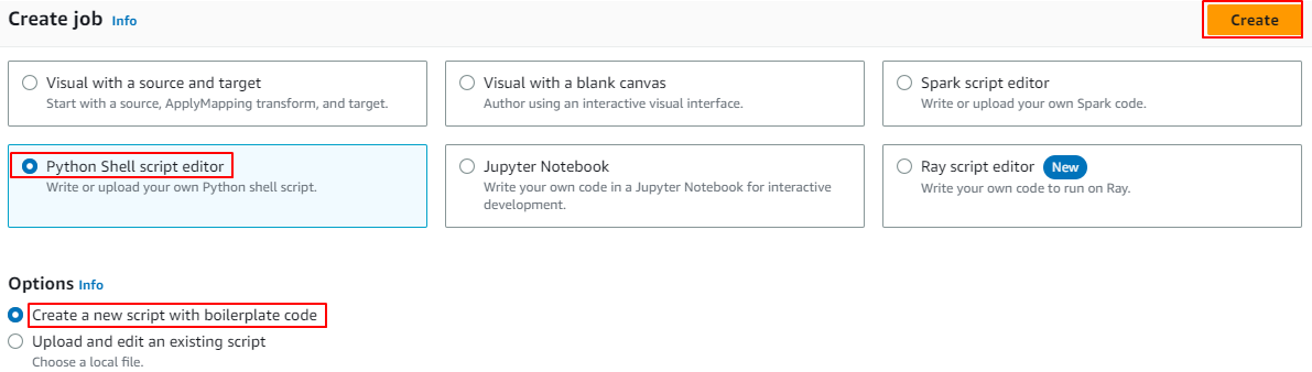 3.「Python Shell script editor」にチェックを入れ、Optionsでは、「Create a new script with boilerplate code」をチェックし右上にある「Create」をクリックします。