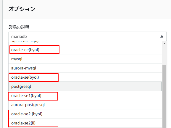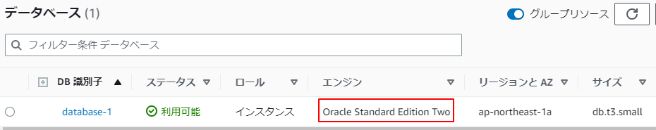 エンジンはRDSの一覧で確認できます。以下はOracle-se2です。