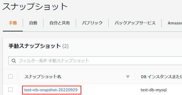 1.RDSのスナップショットの一覧では、「自分と共有」タブに表示されます。