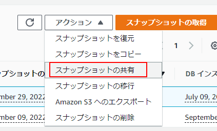 1.スナップショットの一覧でアクションからスナップショットの共有をクリックします。