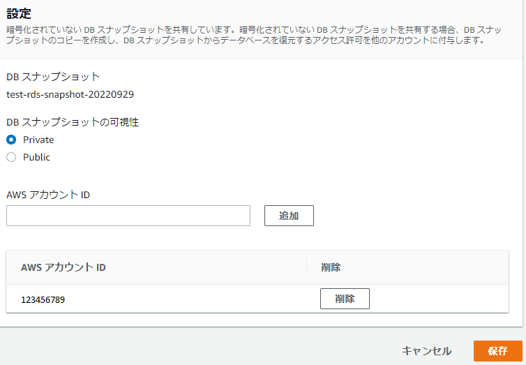 6.DBスナップショットの可視性をPrivateにして共有先のAWSアカウントIDを指定し追加ボタンを押すと下の一覧に表示されます。保存ボタンを押すと共有されます。