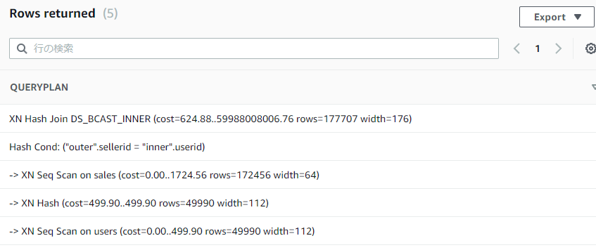 4.画面下に実行計画が表示されます。Exportボタンからテキスト形式でダウンロードも可能です。