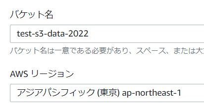 4.バケット名を入力し、AWSリージョン(東京や大阪等)を選択します。