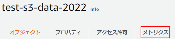1.S3のバケットの一覧から確認したいバケットのリンクをクリックし、「メトリクス」タブをクリックします。