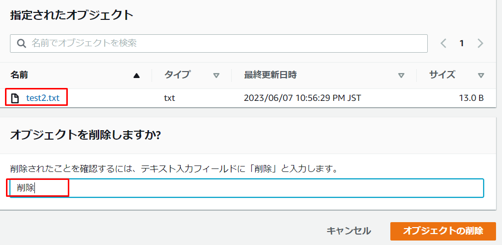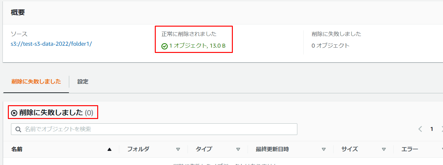 3.1ファイル削除したので、「正常に削除されました」に1オブジェクトと表示されています。