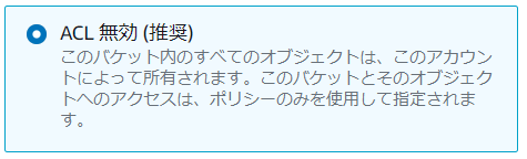 5.オブジェクト所有者は、「ACL無効(推奨)」は「無効にする」にしました。