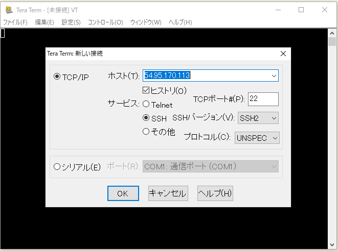1.Teratermで1つめのサーバにsshのポート22でログインします。